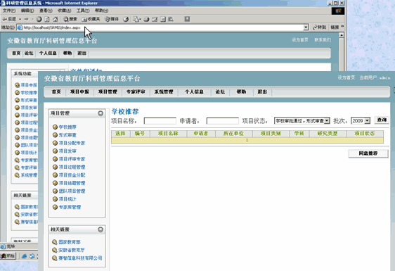 四. 安徽省教育廳科(kē)研管理(lǐ)信息平台 《安徽省教育廳科(kē)研管理(lǐ)信息平台》利用(yòng)當今較為(wèi)先進和(hé)成熟的(de)計(jì)算(suàn)機(jī)信息技(jì)術(shù),在高(gāo)等院校(xiào)和(hé)科(kē)研院所現(xiàn)有(yǒu)的(de)網絡基礎和(hé)Mis平台上(shàng)針對(duì)高(gāo)校(xiào)、科(kē)研項目管理(lǐ)相(xiàng)關業(yè)務開(kāi)發相(xiàng)應的(de)計(jì)算(suàn)機(jī)管理(lǐ)系統,使得(de)高(gāo)校(xiào)、研究院科(kē)研項目管理(lǐ)業(yè)務能(néng)夠高(gāo)效、安全可(kě)靠地(dì)網絡上(shàng)運行(xíng)。統一(yī)的(de)信息訪問(wèn)和(hé)管理(lǐ)平台,将較大(dà)地(dì)加速企業(yè)信息的(de)傳遞發布,加強各部門(mén)之間(jiān)的(de)協同工(gōng)作(zuò),有(yǒu)效利用(yòng)企業(yè)內(nèi)外(wài)信息資源,提高(gāo)管理(lǐ)效率,為(wèi)企業(yè)的(de)經營決策提供便利的(de)信息服務。